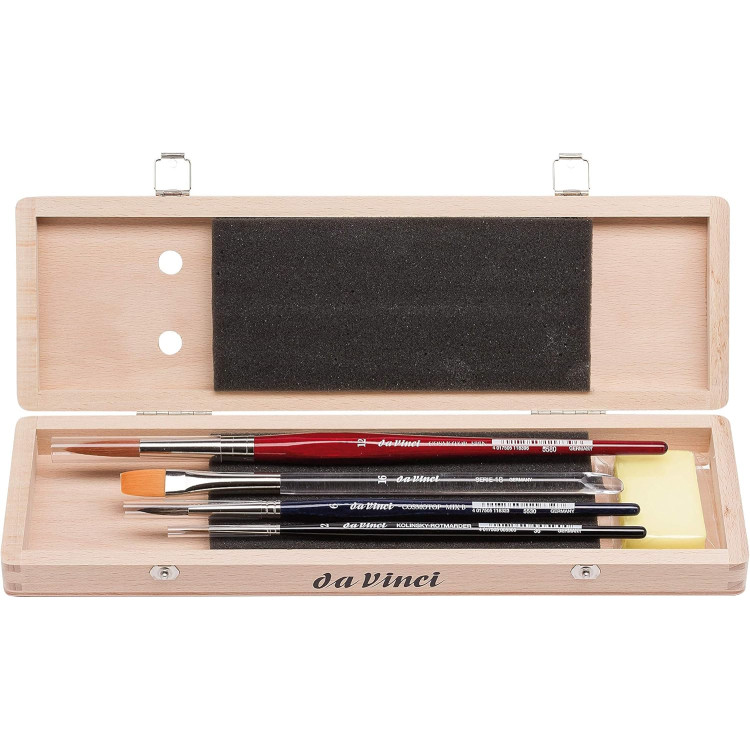 Кисти акварельные DaVinci в наборе WaterColour Set №5260 – оптимальный комплект с высококачественным инструментом для живописи в технике акварели. Представляет собой компактный art-бокс из природной древесины с вентиляционными отверстиями, в котором находятся четыре кисточки для акварельных красок с плоским и круглым пучком разных размеров. Обеспечит акварелистов всем необходимым для максимальной реализации творческих планов и проведения всевозможных экспериментов. Отлично подойдёт на достойный подарок художникам при этом.