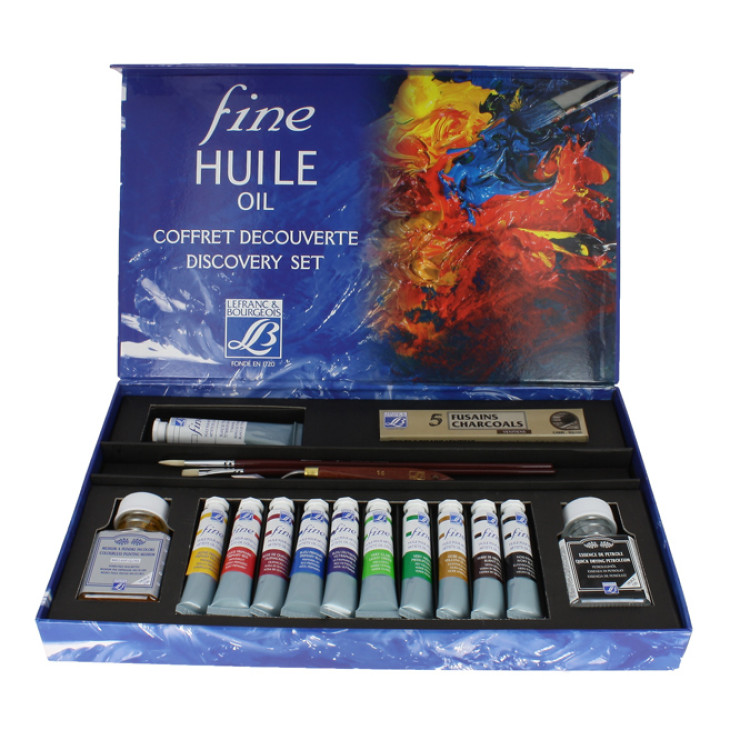 Оцените позицию масляные краски набор Lefranc Set DISCOVERY 106120. Позиция масляные краски набор - это просто замечательнейший подарок для художников всех мастей, которые работают с масляной живописью. В позицию масляные краски Lefranc входят десять туб с красками по двадцать миллилитров каждая. Дополнительно в позицию краски Lefranc входит одна туба (шестьдесят миллилитров) с белой краской, также две кисти, один мастихин с удобной ручкой, один разбавитель (основа – фракционная нефть), также покрывной лак и доп. аксессуары. Данная позиция масляные краски набор продается в красивой подарочной упаковке. Мы рекомендуем данную позицию для людей, которые знают, что такое масляная живопись. А производитель данной продукции не позволит Вам усомниться в качестве предоставленной продукции. Чтобы купить набор масляные краски Lefranc Вам просто нужно связаться с нами.