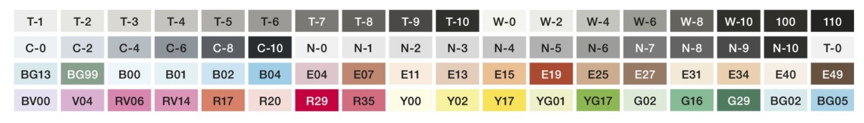 Включенные цвета: Y00, Y08, Y17, YR02, R20, R24, R29, R39, R59, RV06, RV21, RV34, V12, V15, V17, BV00, BV04, BV23, BV31, B00, B02, B12, B18, B21 , B24, B41, B45, BG02, BG11, BG13, BG32, BG45, BG49, G00, G02, G05, G12, G14, G29, G85, YG07, YG11, YG17, YG41, YG67, E00, E02, E04, E07 , E11, E13, E21, E31, E35, E39, E40, E41, E43, E51, E57, C0, C2, C4, C6, C8, C10, N1, N3, N5, N7, N9, 0 (бесцветный блендер)
