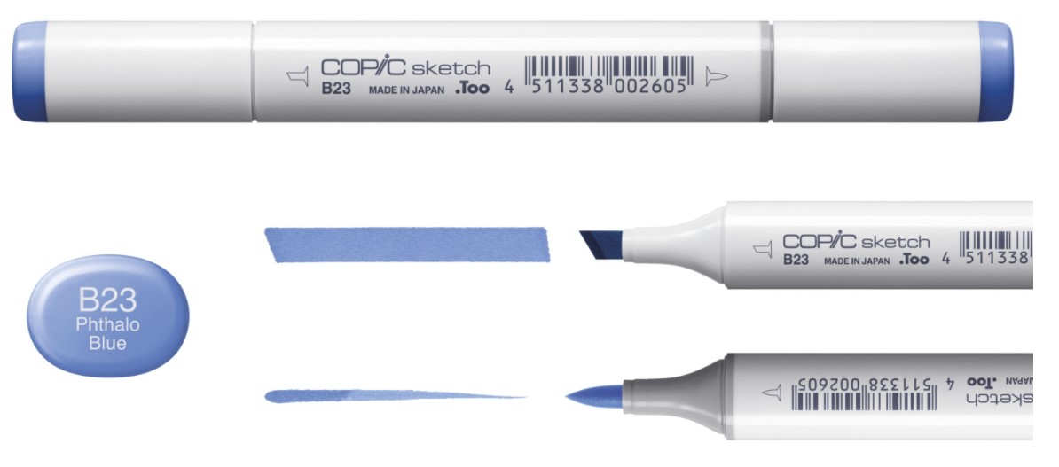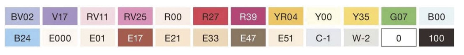 Маркеры Copic Sketch также доступны в виде отдельных маркеров 357 цветов и нейтрального блендера. Включенные цвета: E47, E51, C1, W2, 0, 100, B24, E000, E01, E17, E21, E33, R39, YR04, Y00, Y35, G07, B00, BV02, V17, RV11, RV25, R00, R27