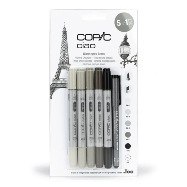 Набір спиртових маркерів Copic Ciao Set 5+1 Warm Gray Теплий сірий, 5 шт+лайнер ідеально підходить для художників, дизайнерів, архітекторів та інших творчих осіб. Маркери мають теплі сірі відтінки, які дозволяють створювати відмінні тоновані і переходові ефекти. Лайнер, який входить до комплекту, допомагає додати деталі і контур до вашого творіння.