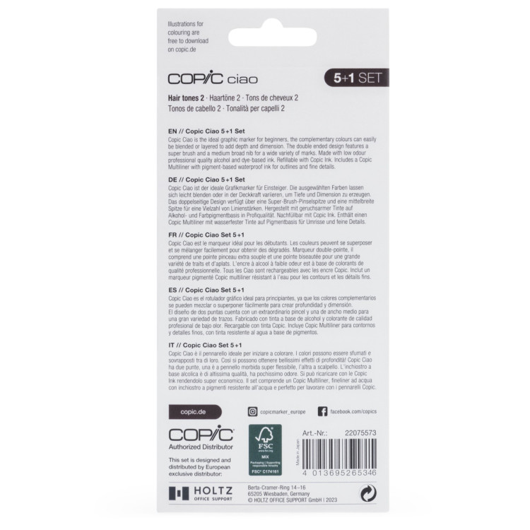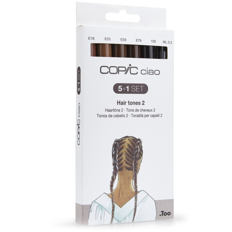 Copic Ciao Set "5+1", Hair Tones 2 - це ретельно підібраний набір для створення реалістичних текстур волосся, об'ємних ілюстрацій та художніх проектів. Включає п'ять маркерів Copic Ciao та один багатофункціональний Copic Multiliner для роботи над контурами та деталями. Маркери відрізняються якісним спиртовим чорнилом, яке легко розтушовується і дозволяє створювати плавні градації. Особливості набору Copic Ciao Hair Tones 2: