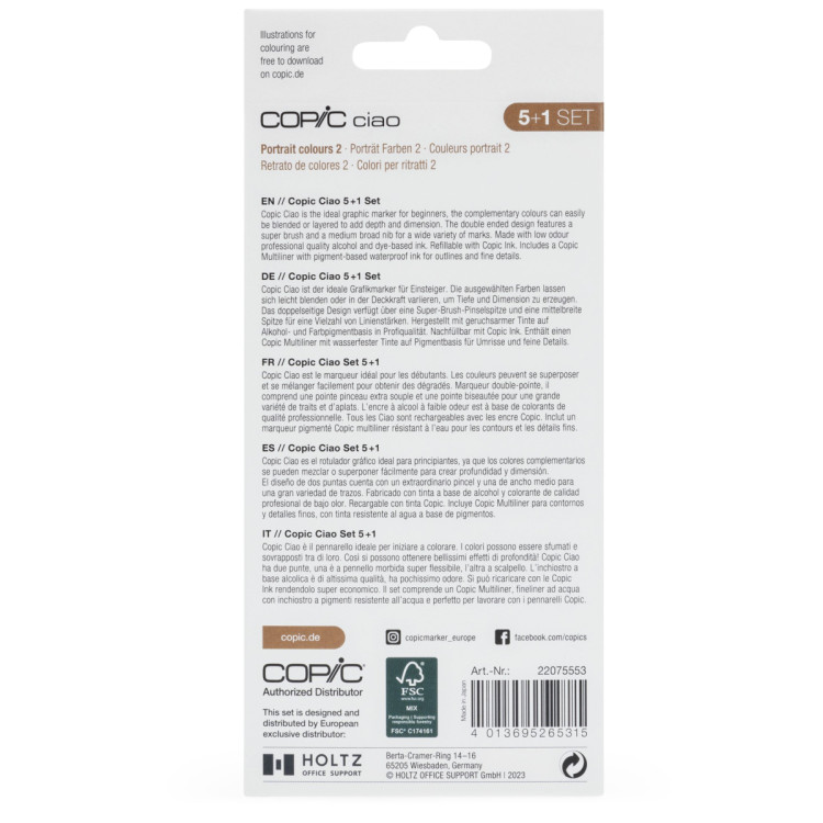 Copic Ciao Set "5+1", Portrait 2 - це ретельно підібраний набір маркерів для створення реалістичних портретів, ілюстрацій та художніх проектів. Включає п'ять маркерів Copic Ciao з гармонійними відтінками для роботи зі шкірою, тінями та відблисками, а також один багатофункціональний Copic Multiliner для чітких контурів та деталей.