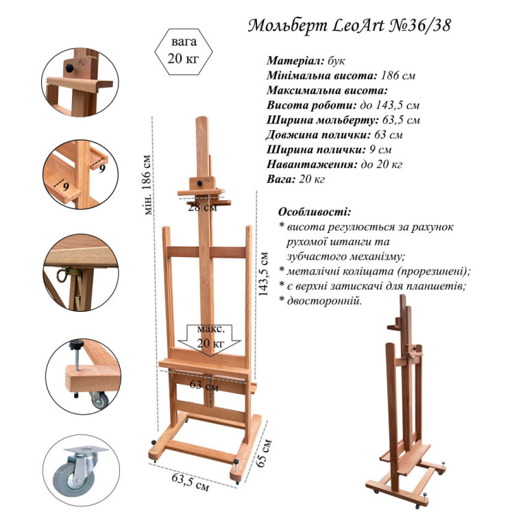 - Комплектація: мольберт студійний Академічний LeoArt-36/38