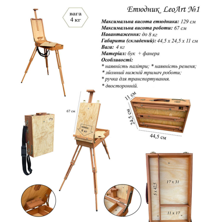 Етюдник Е1 має середні розміри 410х310х100 мм, вагу 4 кг і висоту, що регулюється до 70 см. Він ідеально підходить для встановлення робіт будь-яких розмірів. Крім того, цей етюдник має верхній затискач і ніжки, які складаються в скриньку для зручності зберігання.