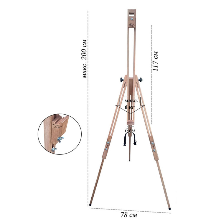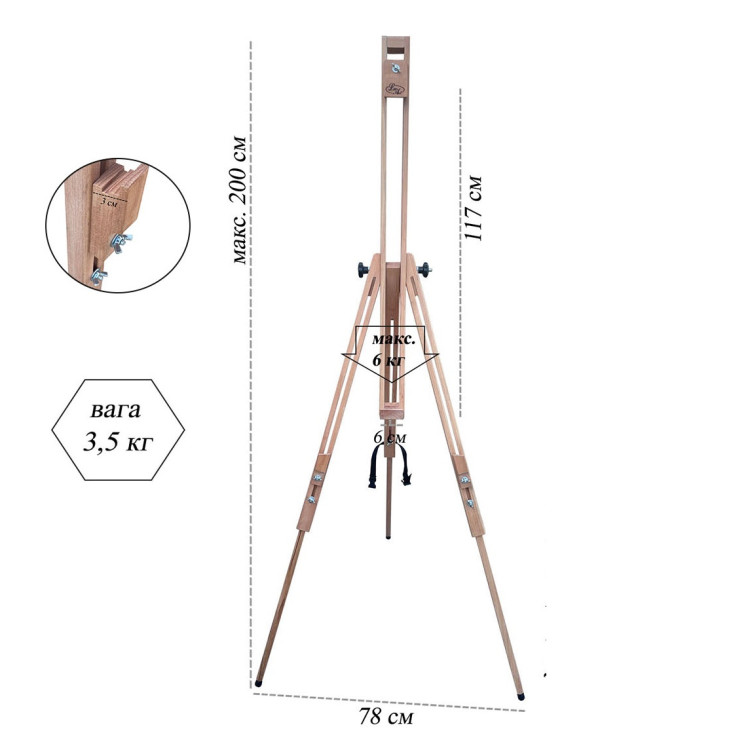 Мольберт тринога художній LeoArt-23 - це ідеальний аксесуар для художників будь-якого рівня. Вироблений з просоченого лляною олією карпатського бука українського виробництва, цей мольберт легко розкладається і зручний при перенесенні. Модель LeoArt-23 ідеально підходить для роботи як у приміщенні, так і на відкритому повітрі, дозволяючи розмістити полотно в горизонтальному положенні. Нахил поверхні регулюється гайкою «барашкою». Купити Мольберт художній тринога LeoArt-23