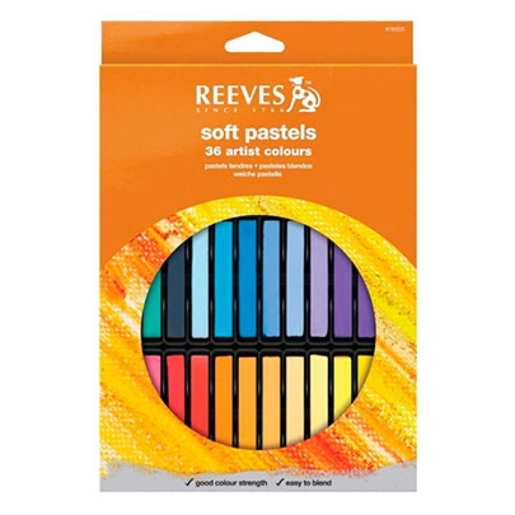 Набір пастелі Reeves - це 36 кольорів сухої м'якої пастелі, що містить якісний і добірний пігмент. Їх квадратна форма дозволяє легко наносити лінії різної товщини, має високі коефіцієнти світлостійкості. Кольори яскраві, виразні та насичені.